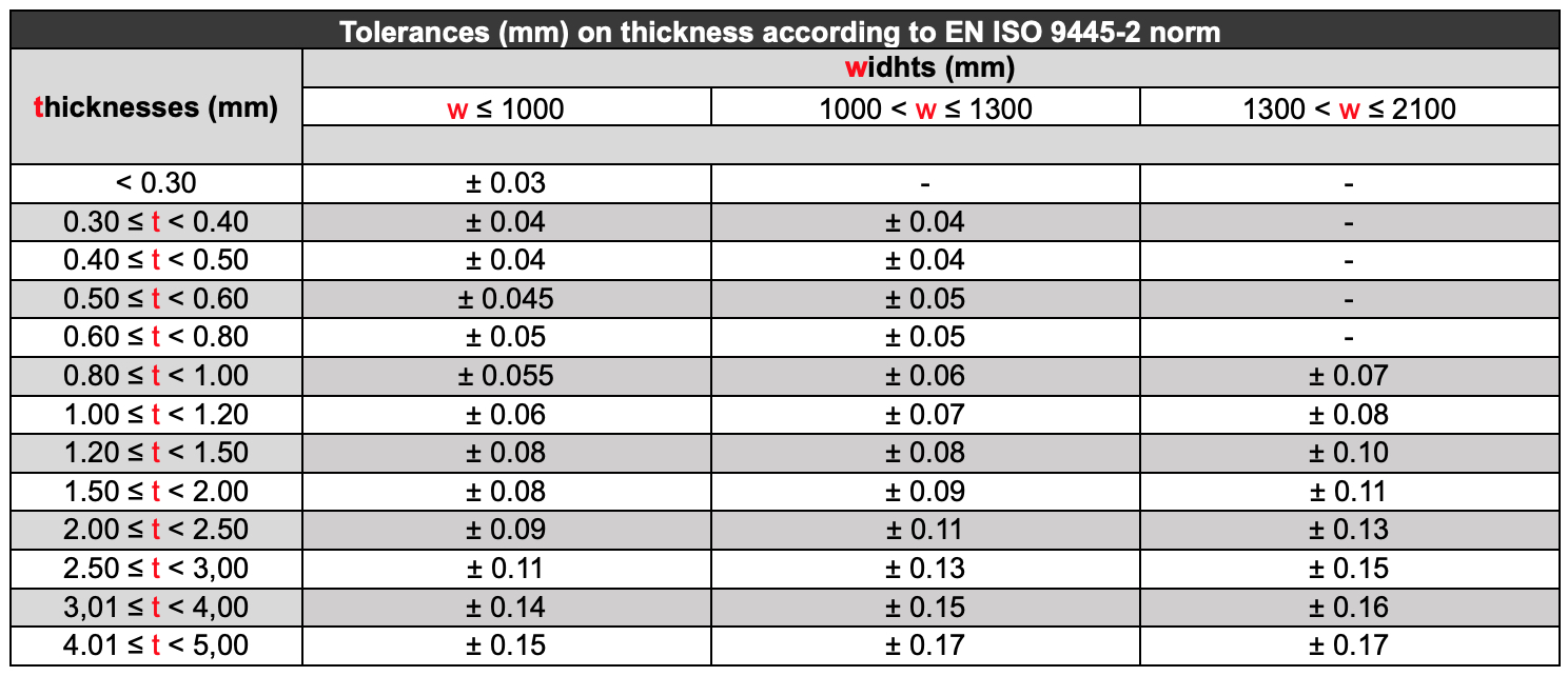 Il materiale ricotto è disponibile in una gamma di spessori variabile da 0,05 mm a 5,00 mm e larghezze comprese tra 3,5 mm e 600 mm, rispettando le tolleranze dimensionali previste dalle normative.